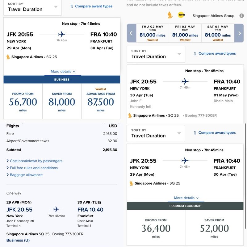 Beautiful Tip: Sometimes the best value for booking an award flight is to NOT book directly with the airline. Crazy right? For a long time, you were only able to book Singapore premium cabin awards through KrisFlyer but it is now possible to book business class with their partners, specifically Air Canada Aeroplan. And this is where it gets interesting, booking through AC would only be 60K Aeroplan miles + CA$78 VS 81K KrisFlyer Miles + $5.60 which is almost the 30% discount I had booking the Spontaneous Escape promo fare! Biggest difference is ability to book significantly further ahead ie I’m finding March 2025 SQ business seats now through Aeroplane for the 60K price!