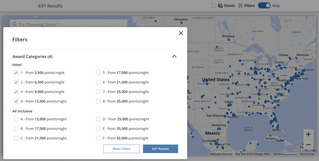 It can be confusing to what hotels are classified in these categories but Hyatt has a Hotel Explorer tool where you can filter by region and category. You can then see a map or list view of all potential properties as seen above.