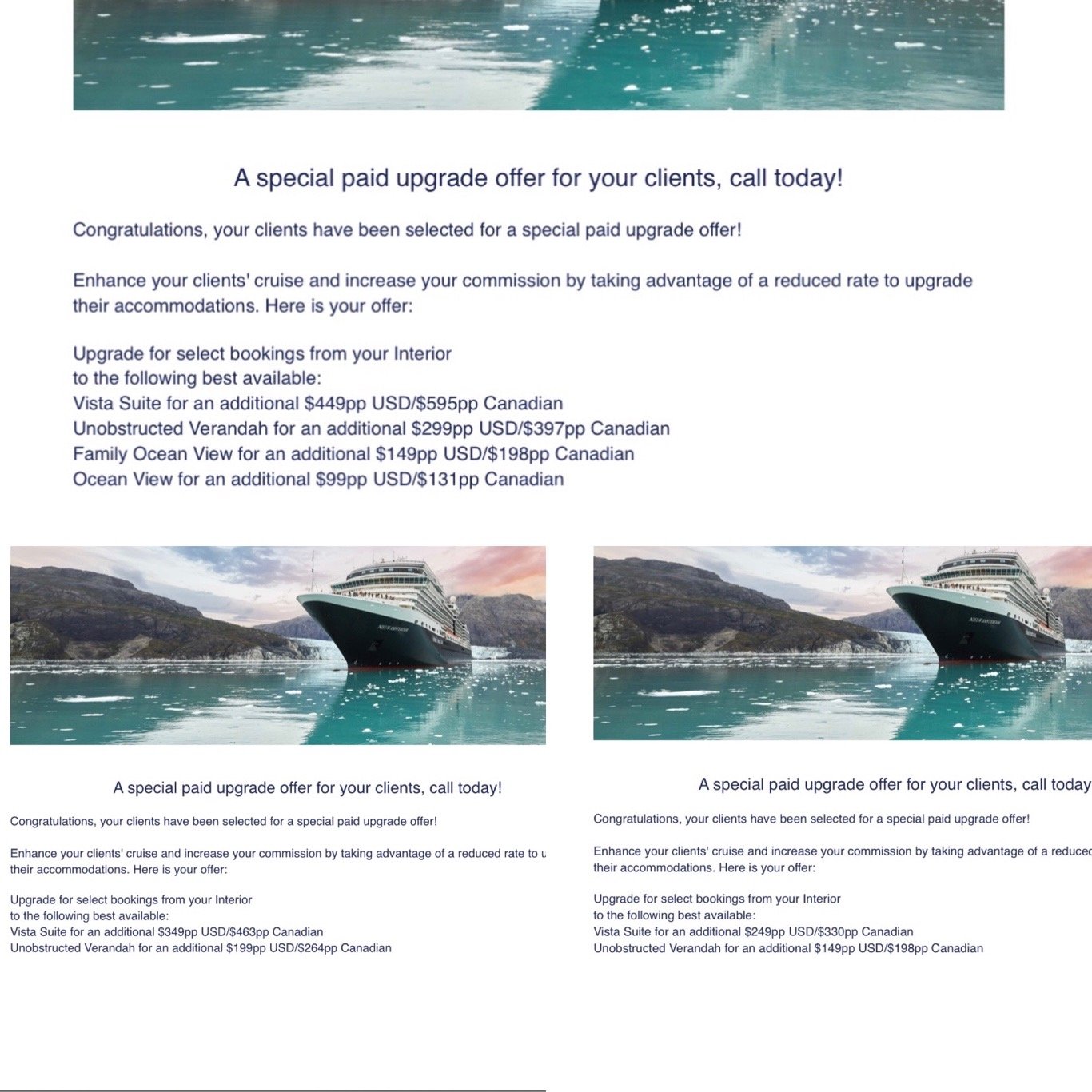 Additionally, you may also receive offers close to your sailing date based on ship occupancy. I received my first upgrade offer about 1 month out (top photo), two weeks later (bottom left) and the final offer, a few days days after the second offer (bottom right). *I wasn’t interesting in upgrading so I never called in. Now I wish that I would have to check on offer details with sailing solo ie would I pay 2x the upgrade price or would it be more with the solo supplement charge?