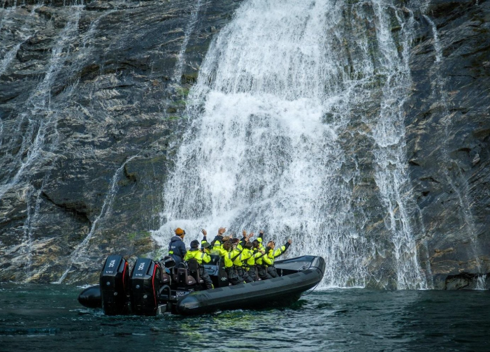 A RIB (rigid inflatable boat) is built for high maneuverability and speed which is perfect for what we were doing – having some fun by going full throttle on the high-octane RIB boat along with being to get close enough to the waterfalls to be splashed while also having some times of cruising and just enjoying being in and surrounded by Geirangerfjord.