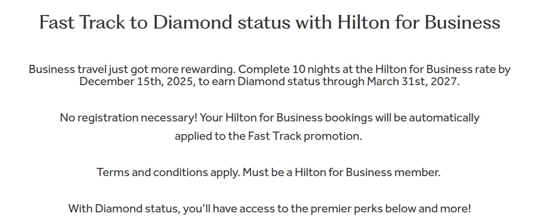 The Hilton for Business program is offering a fast track to Diamond status for those enrolled in the program after staying only 10 nights by December 15, 2025!