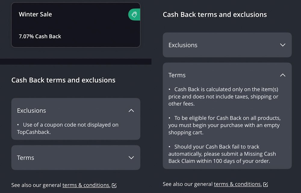 - Make sure to read the terms and exclusions to ensure that your purchase will be eligible for cashback!