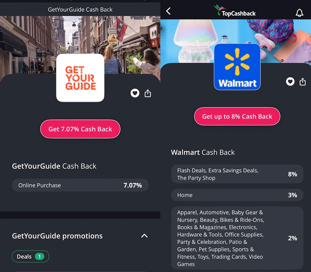 Cashback rates are constantly changing but this is what is currently being offered on GetYourGuide (up to 7.07%) on Walmart (up to 8%) respectively! I chose these two merchants for specific reasons I will delve into below. Quick Note: note how this is from the app? For Rakuten and TopCashBack, I personally use the app whenever I can (some merchants require you to use a computer) – I always say to make life as easy as possible and practice what I preach to ensure that tracking of purchases is seamless