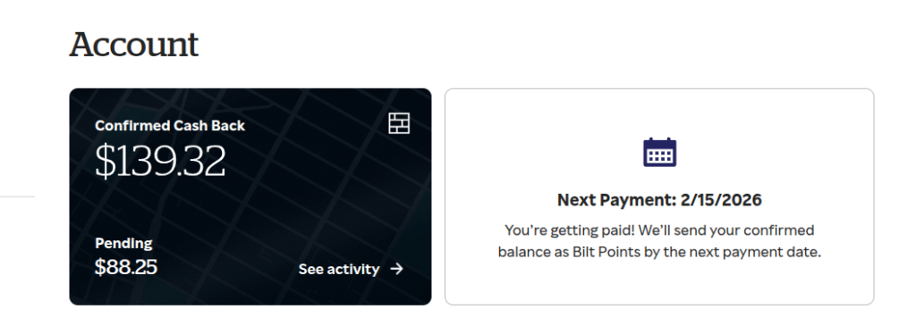 In your Rakuten account, once you’ve successfully linked your accounts, under the “Account” section, and you’ll see that the account shows that you’ll be earning Bilt points as your reward. Reminder that all rewards amounts always show in cash, but are then converted into Bilt points at the rate of $10 in Rakuten cash back equals 1,000 Bilt points or in my case, I will get 22,757 Bilt points on 2/15/2026 (confirmed $139.32 +pending $88.25 = $227.57 x 100)