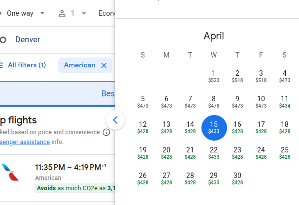 The first photo shows what the cheapest reward flights from DEN (Denver, Colorado) to ANU (Antigua) in April 2026. With the lowest price being 11,000 miles and $45.60 in taxes vs paying $428 in cash for the same period as shown in the second photo.